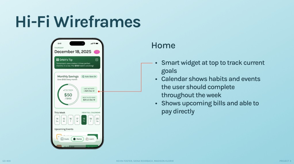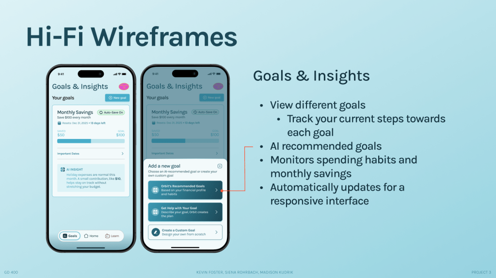Through extensive research, the creation of user personas, psychological insights, and an iterative design approach, I, in collaboration with two teammates, designed and developed a prototype for an AI-powered financial wellness companion. Geared towards young adults, ‘Orbit’ offers adaptive tools for learning about financial matters and setting clear goals.