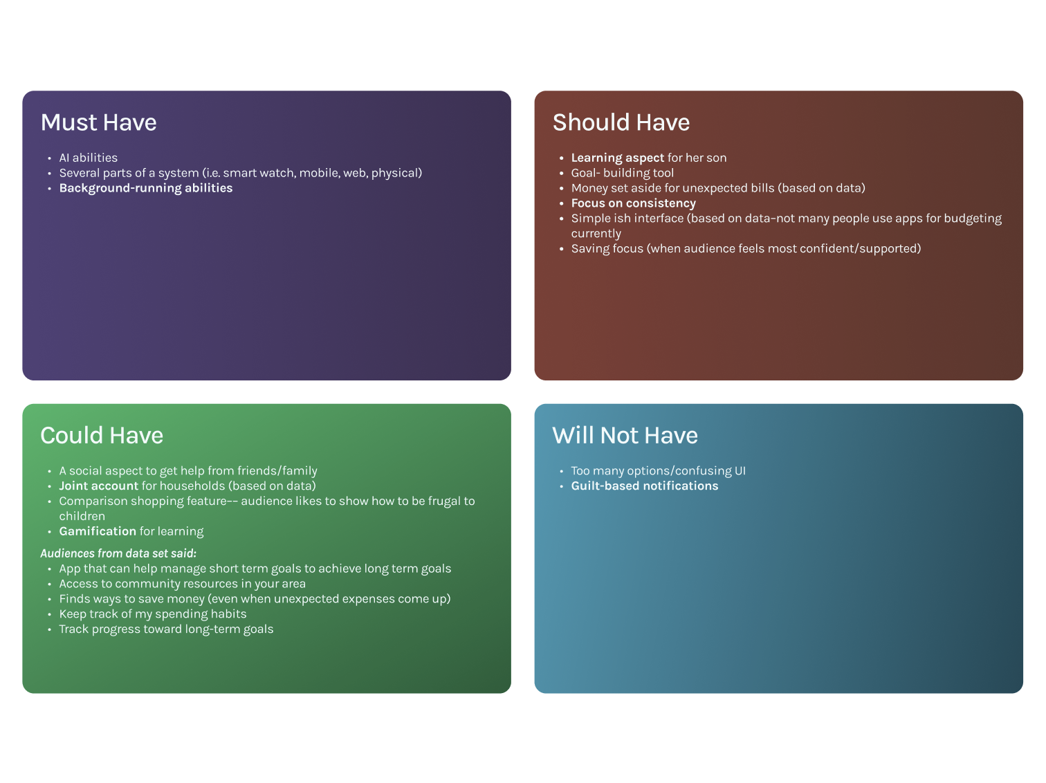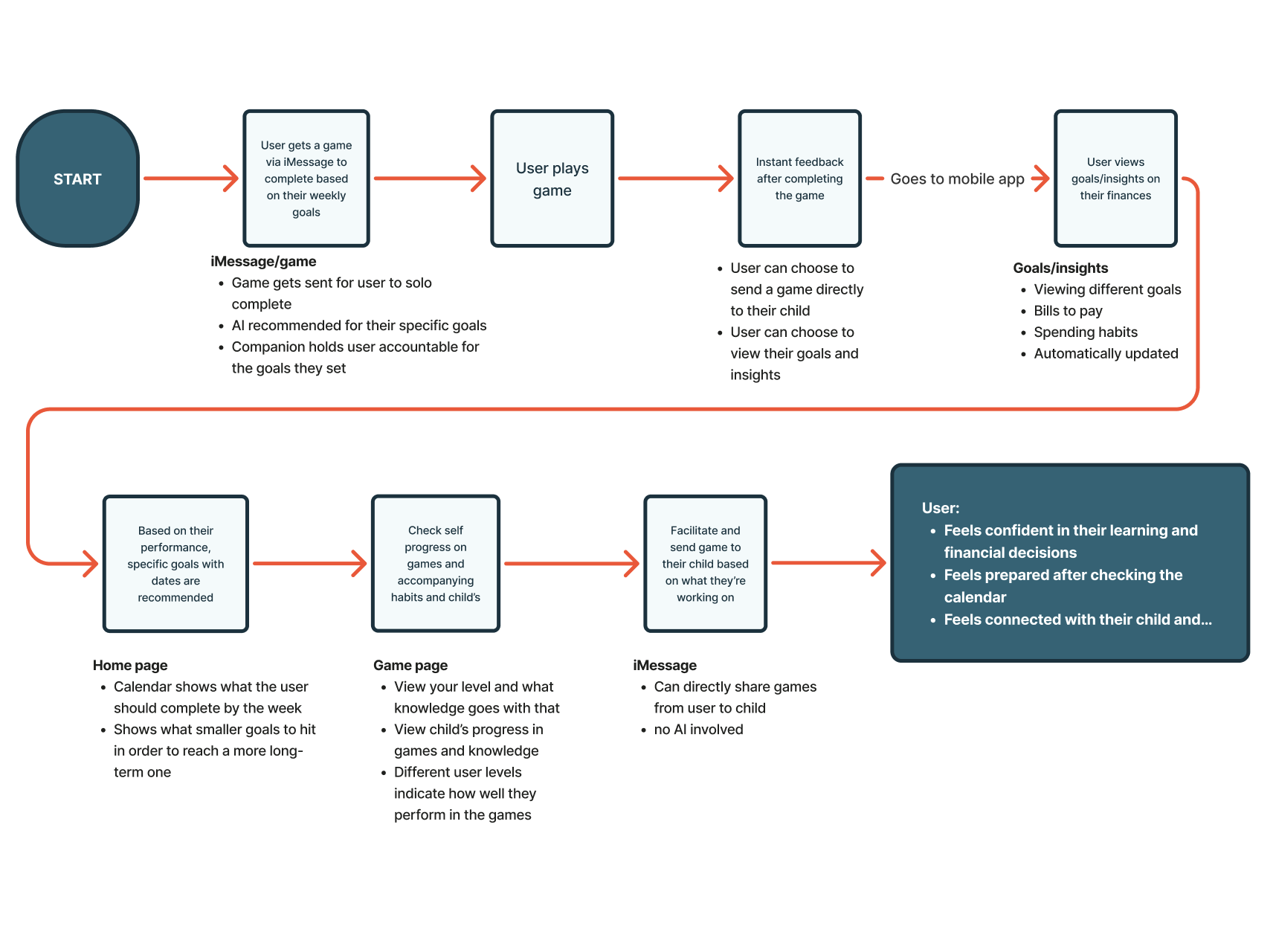 Throughout these steps, I continually aligned my work to our project mission statement, “Empowering families to build confidence and a secure financial future by turning everyday moments into engaging experiences that strengthen mental well-being and financial habits.”