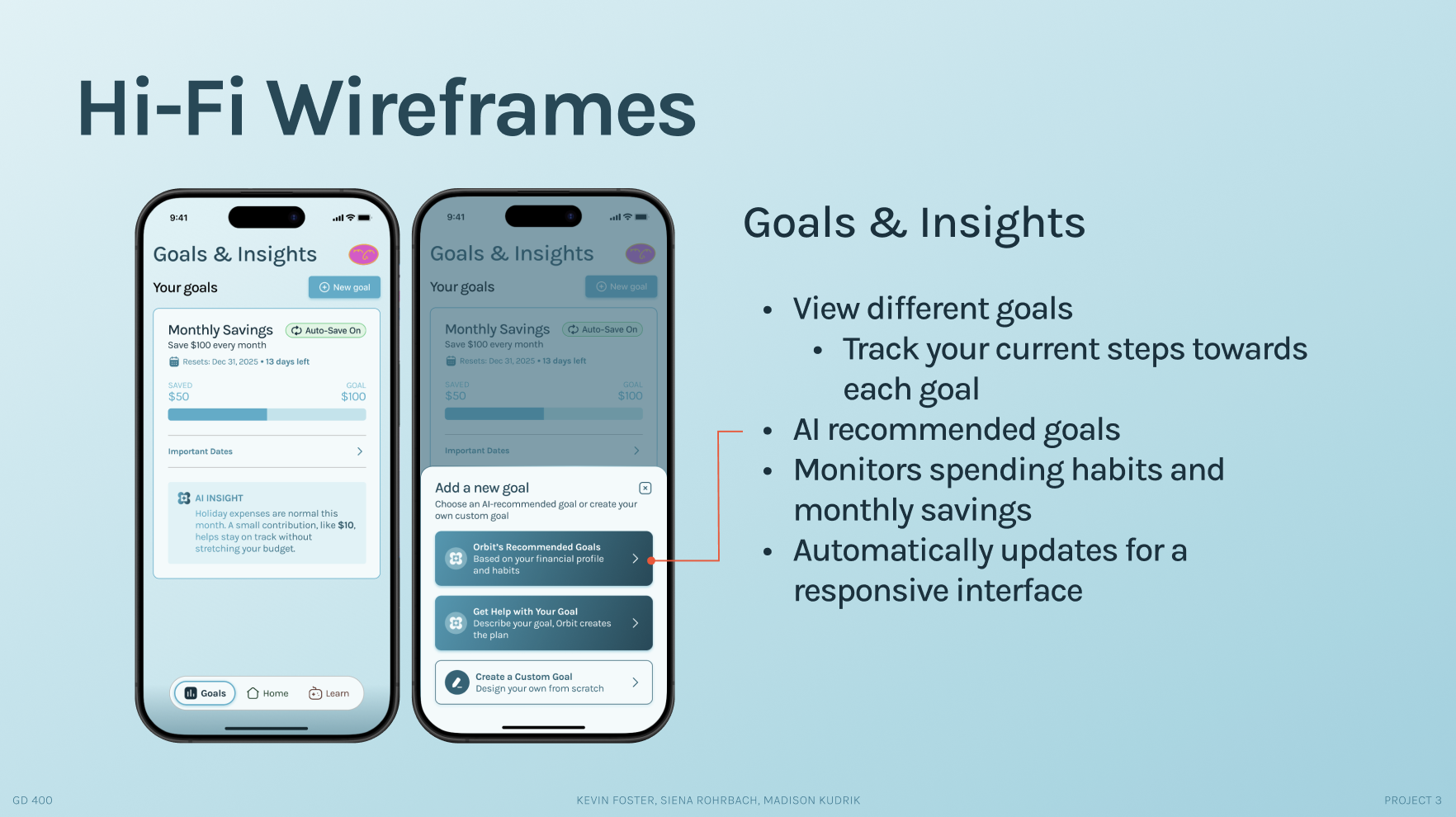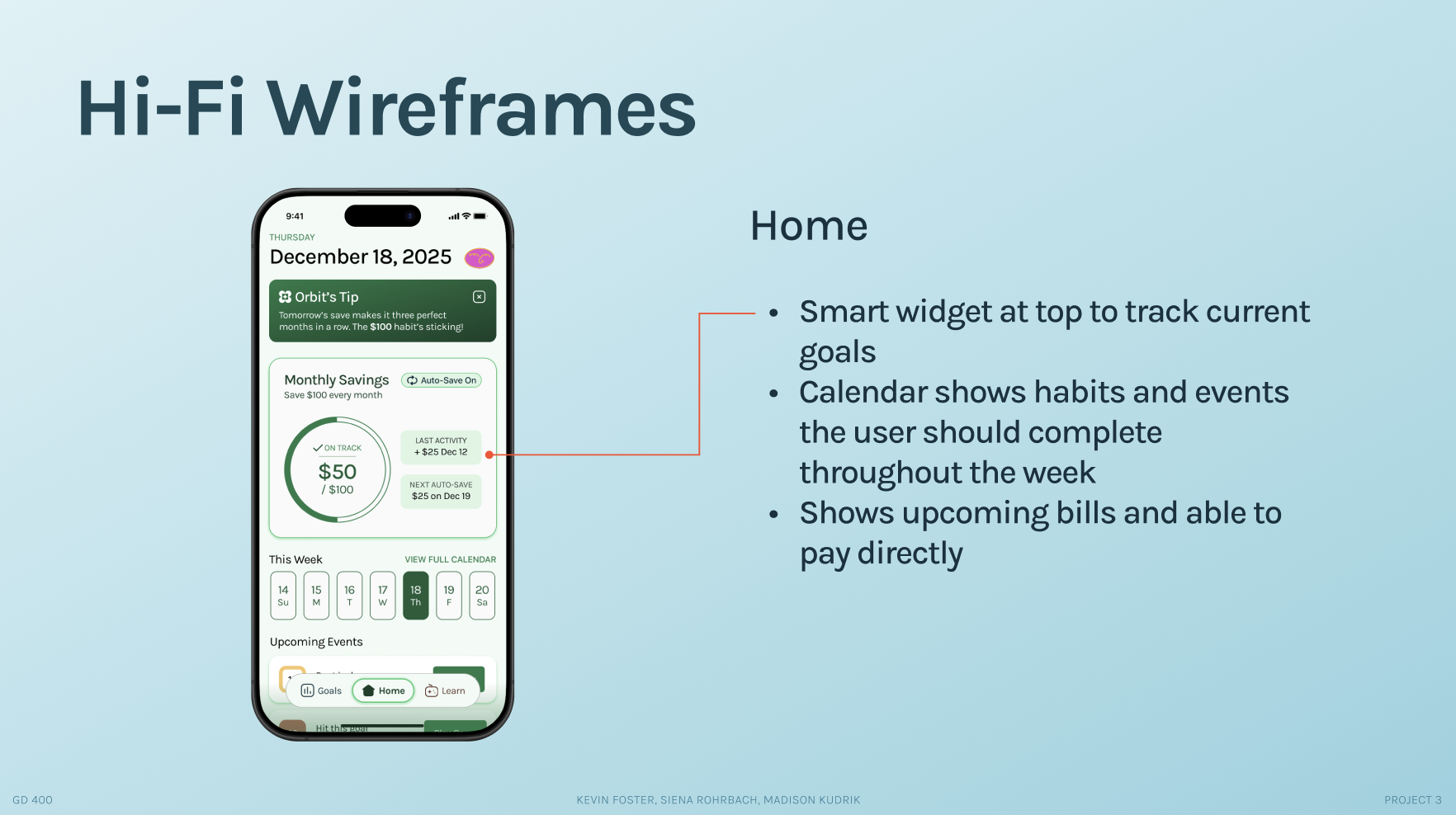 Through extensive research, the creation of user personas, psychological insights, and an iterative design approach, I, in collaboration with two teammates, designed and developed a prototype for an AI-powered financial wellness companion. Geared towards young adults, ‘Orbit’ offers adaptive tools for learning about financial matters and setting clear goals.