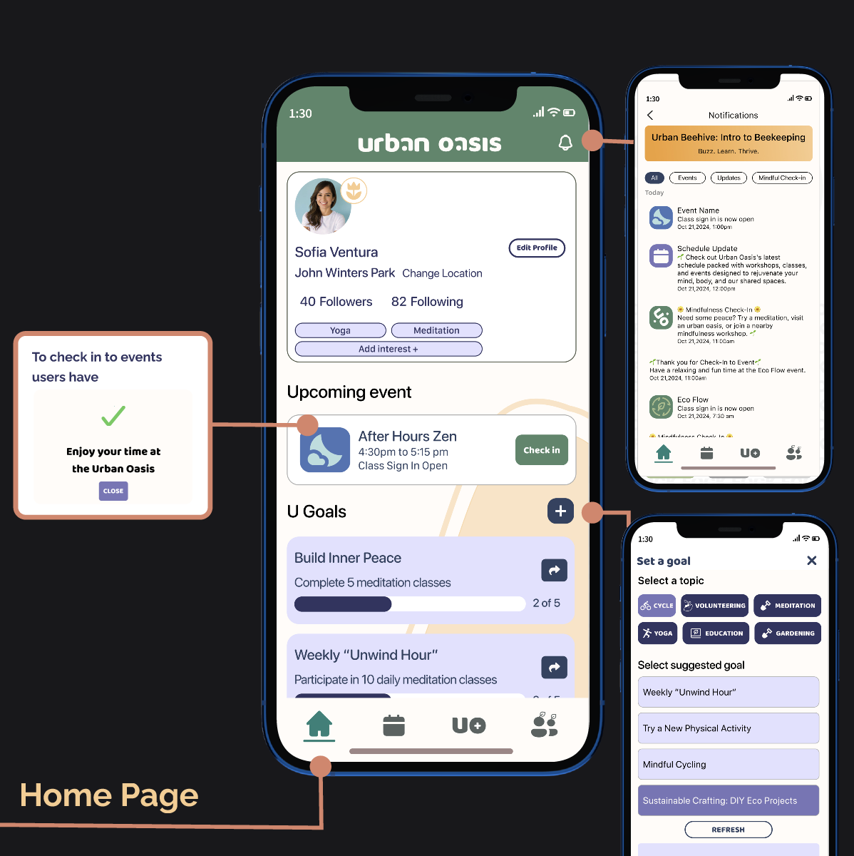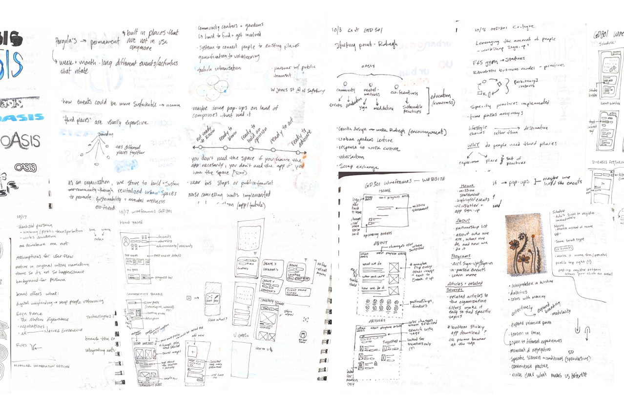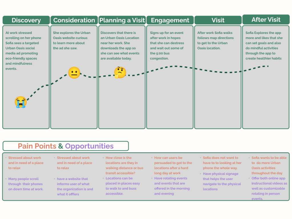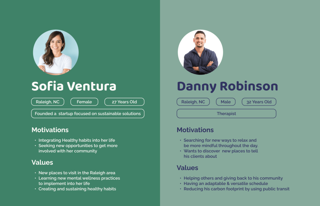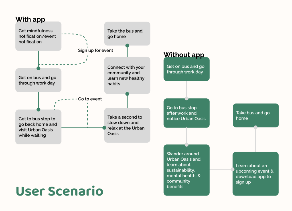 To identify pinchpoints that people encounter when accessing mental health resources, I examined various psychological research articles and the intersection of our main themes. This work provided insights that highlighted the importance of community building that lives in harmony with the environment. I used these discoveries to frame the core values of the project and inform my design direction, which focuses on bolstering community engagement while fostering sustainability efforts.