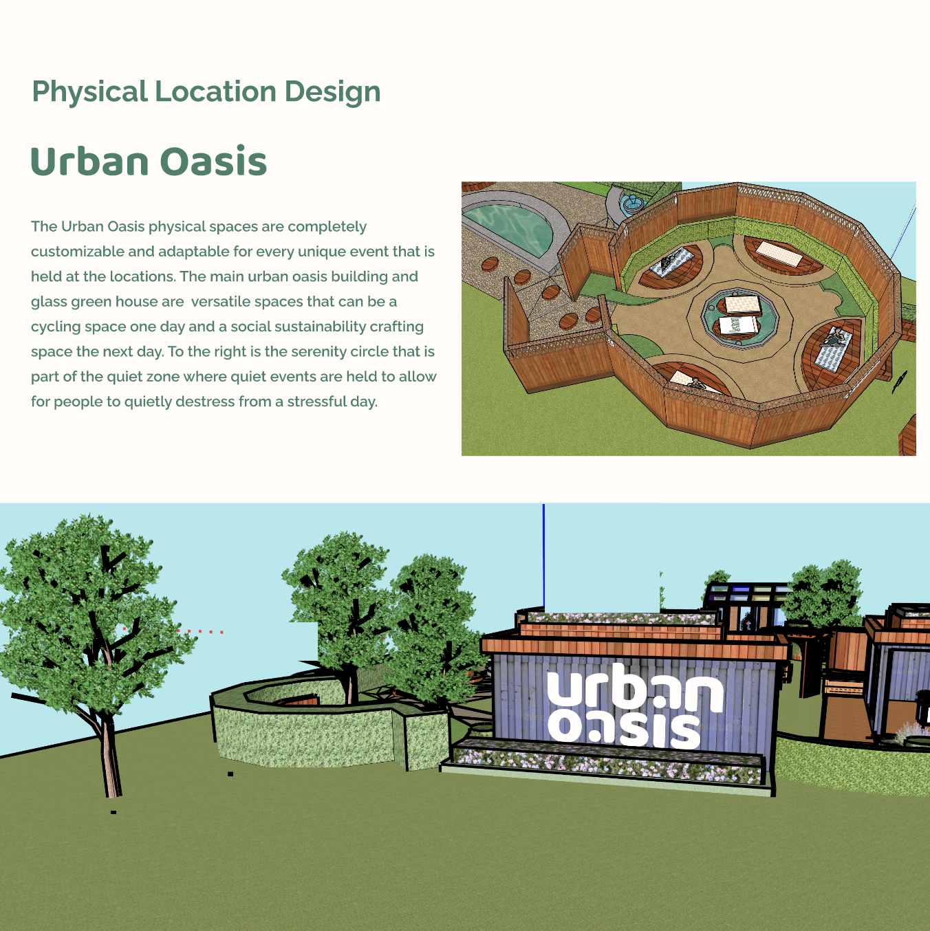 As a next step, I’d like to create VR walkthroughs of the Urban Oasis physical spaces, demonstrating how branding and environmental design converge in real life.