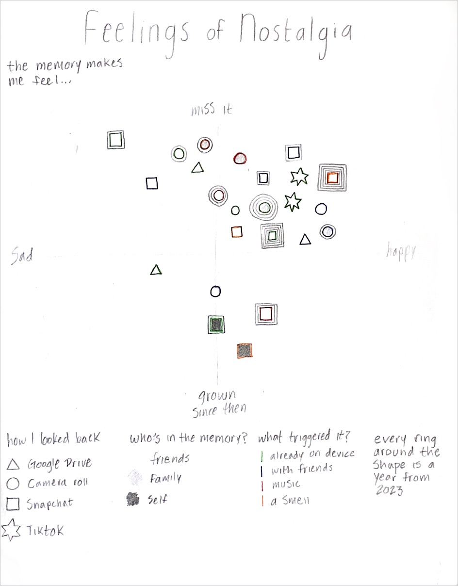 In response to a prompt to collect individual data, which was given in my fall sophomore studio—Design, Context, and Experience—I recorded information about specific memories and how I chose to relive them. I amassed a week’s worth of data and then developed rough drafts that visualized my findings. I continued iterating and assessing my approach, which led me to create an interesting and informative visualization. When presenting my “graph” to my peers, I discovered that little explanation was needed to read it, which was an important goal for me. Seeing connections between each of the data types I collected was interesting because it helped me recognize the interconnectedness of my feelings and actions. I’m glad I developed a robust set of data points because it enabled me to integrate different findings iton one cohesive design. I will carry forward my learnings from this project and apply them to information-dense projects in the future.